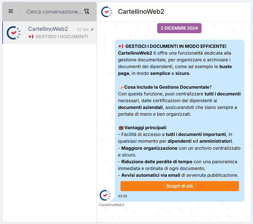 Il resonconto della conversazione sarà visibile anche sul Modulo Messaggi, verrà indicato come Oggetto della conversazione “CARTELLINO” + riferimento del giorno + cognome_nome utente. Sia il dipendente che il titolare potranno rispondere direttamente dal cartellino presenze oppure sulla schermata principale del modulo.